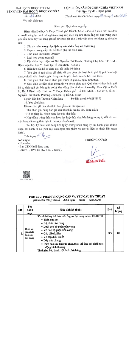 Bệnh viện Đại học Y Dược Thành phố Hồ Chí Minh – Cơ sở 2 kính mời các đơn vị có đủ năng lực và kinh nghiệm cung cấp dịch vụ sửa chữa ống soi đại tràng theo yêu cầu chi tiết thư mời chào giá số: 41/CS2 ngày 02 tháng 02 năm 2026. Tải thư mời chi tiết tại đây